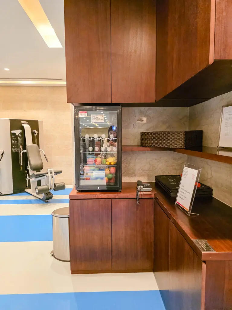 健身房令人印象深刻,空間寬敞,採光充足,各種尺寸的壺鈴、啞鈴、跑步機、橢圓機和重訓設施都有,並且還有為健身房用戶提供免費新鮮水果和飲用水。