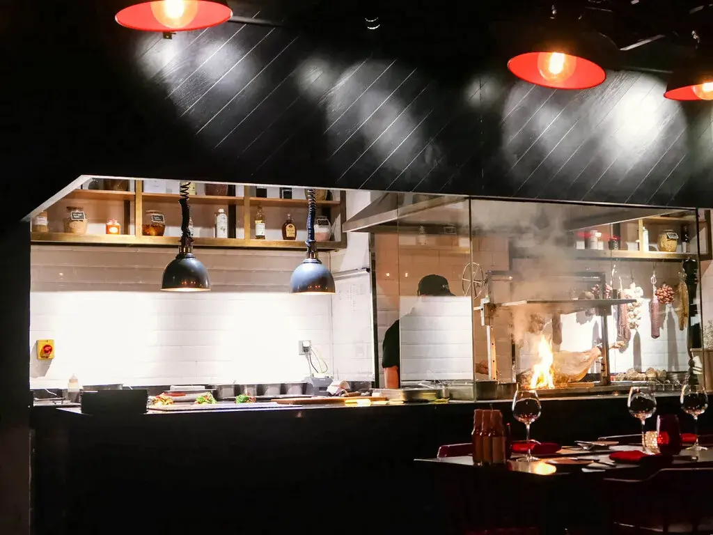 胡志明市 Madcow Wine & Grill 餐廳的開放式廚房,廚師正以柴燒火烤方式料理招牌牛排,展現強烈烹飪氛圍。