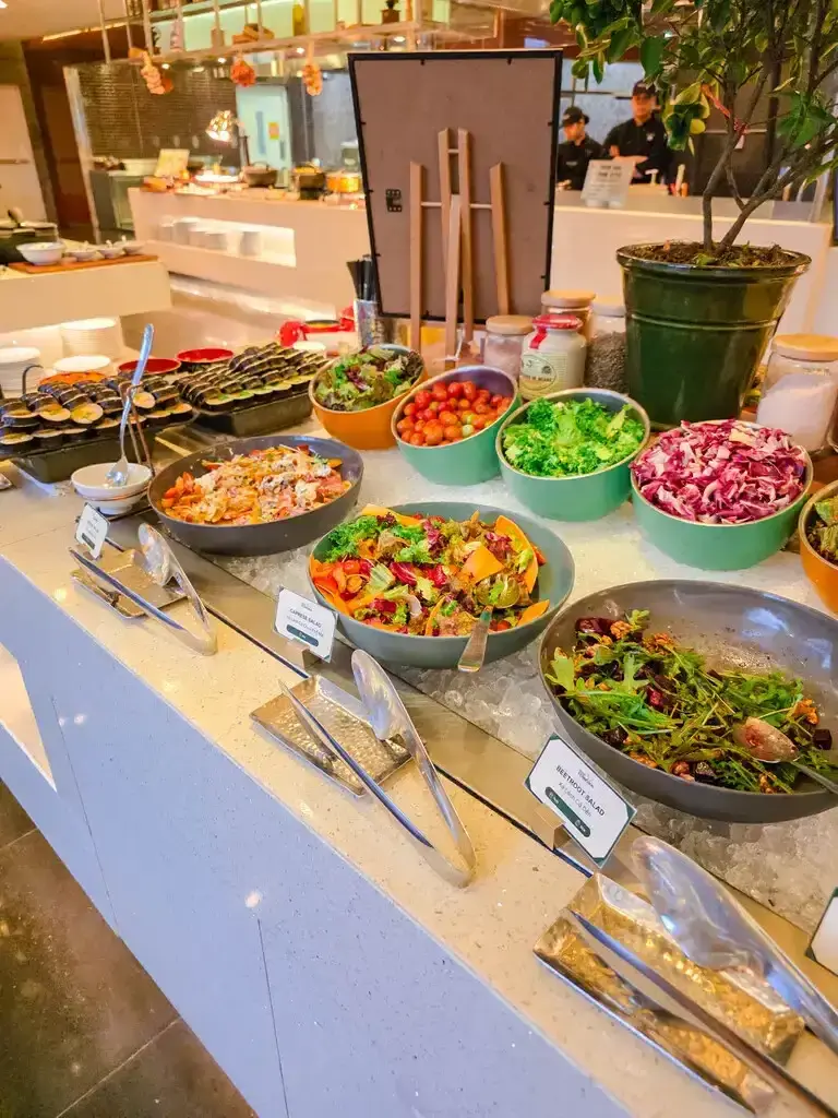胡志明市飯店早餐提供種類豐富的健康沙拉吧,提供多種新鮮有機生菜、堅果配料與特製醬汁。