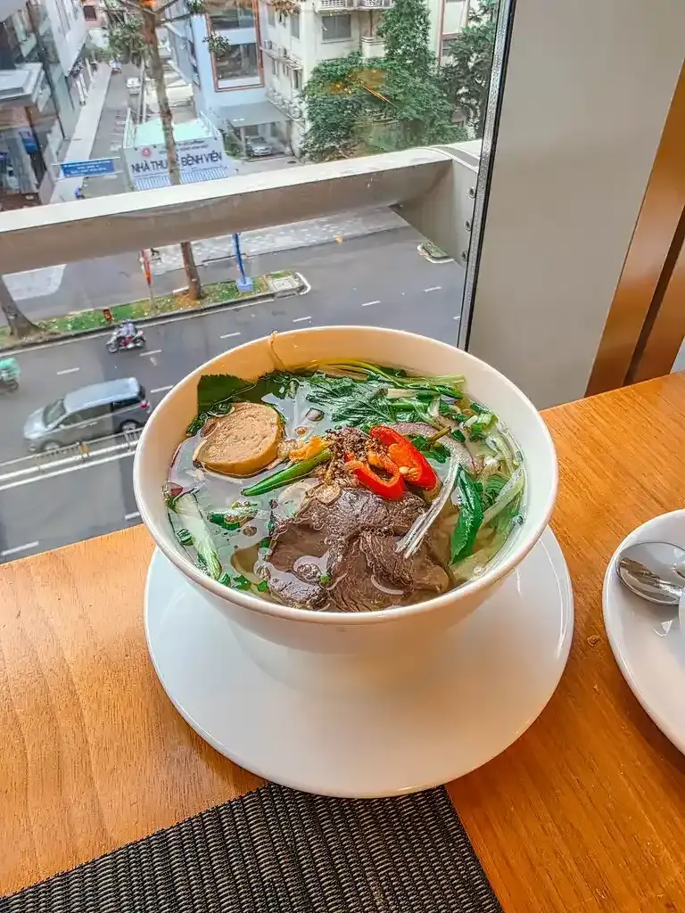 廚師站在開放式廚房裡,會當場在碗裡澆上滾燙的清湯,把肉片燙熟。湯頭是慢火熬煮的牛骨高湯,清澈鮮甜,加點魚露、辣椒、檸檬汁,那股層次豐富的鮮味,瞬間把一大早的味蕾喚醒。
