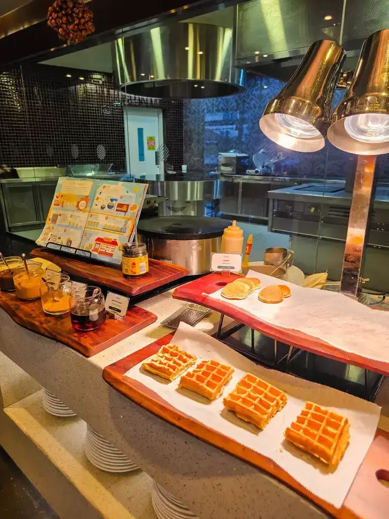 胡志明飯店早餐的現做格子鬆餅 (Waffles) 與美式煎餅 (Pancakes) 專區,可自由搭配楓糖漿與蜂蜜。