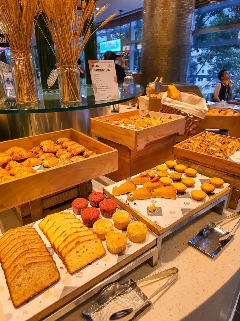 Pullman 招牌烘焙麵包區,包含酥脆可頌、磅蛋糕、丹麥麵包與每日現烤歐式麵包。