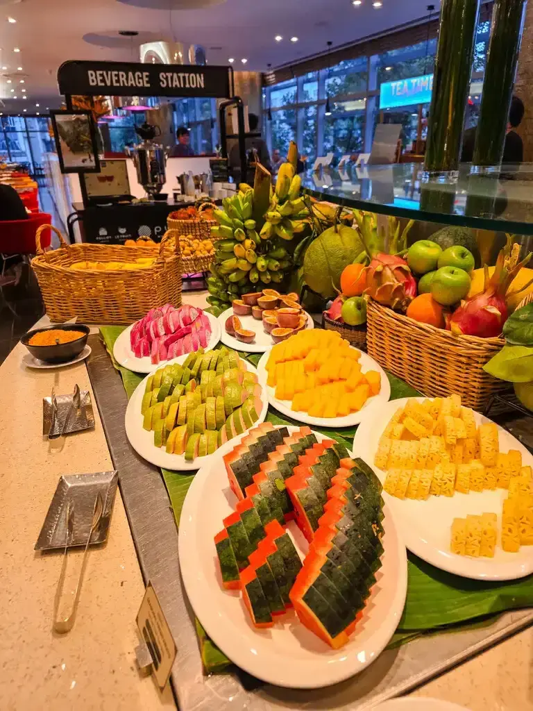 胡志明市吃到飽的越南熱帶水果專區,無限量供應新鮮火龍果、鳳梨、西瓜與柚子。