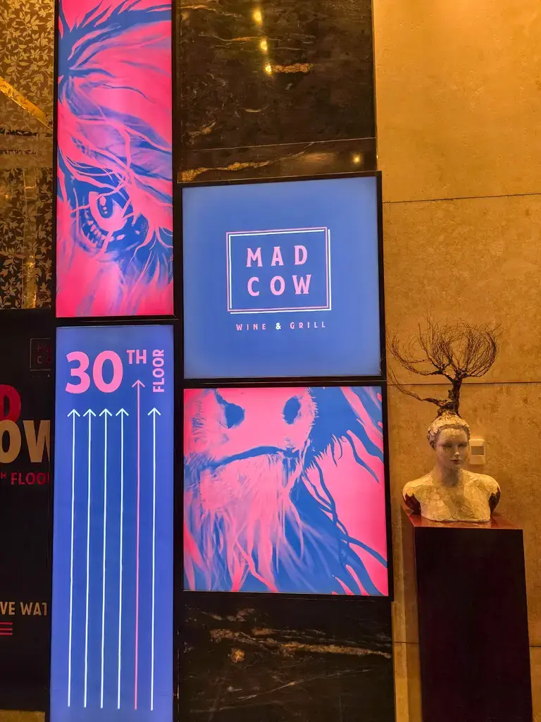 Entering Madcow Wine & Grill on the 30th floor of Pullman Saigon Centre, guests are greeted by a striking neon art installation alongside the floor directory, overlooking Ho Chi Minh City.