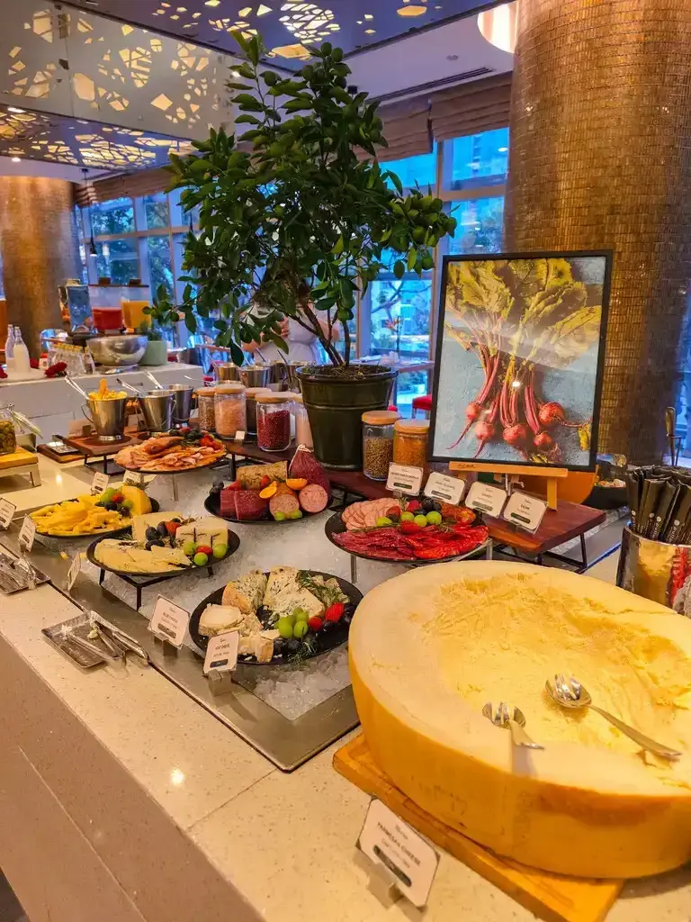 胡志明市五星級飯店早餐冷盤區展示巨大的帕馬森起司輪 (Parmesan Wheel) 與各式精選冷肉切盤 (Cold Cuts)。