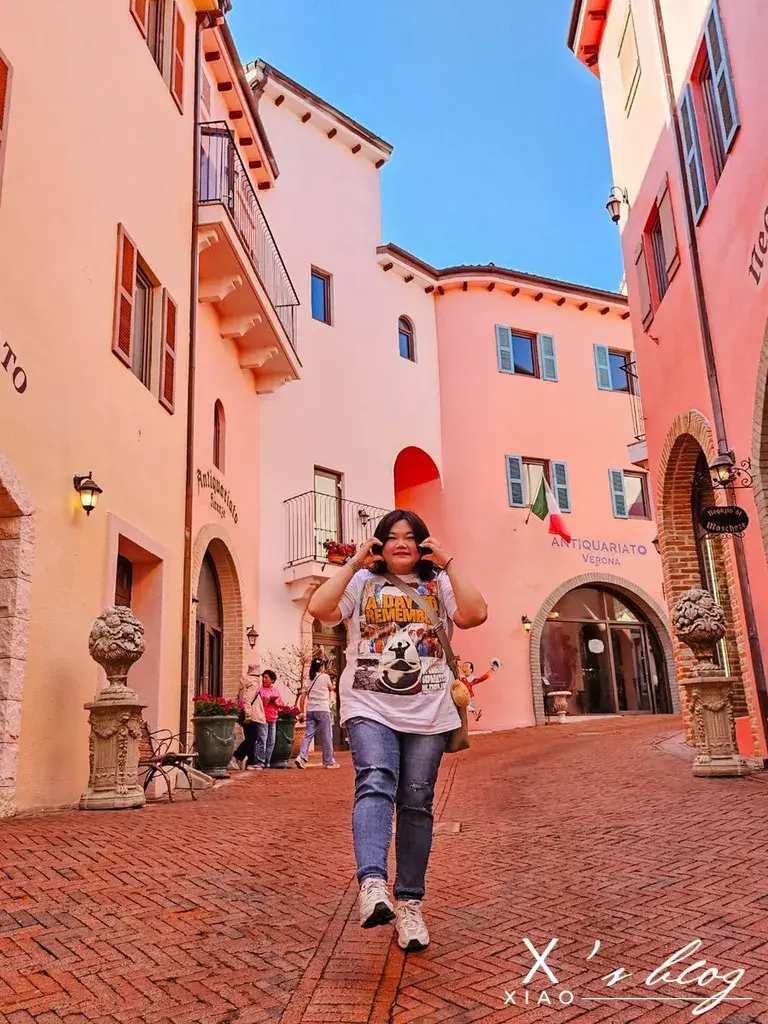 與小法國村的浪漫甜美不同,義大利村以托斯卡尼風格的紅磚建築為主,高大古樸的石屋搭配拱門、迴廊和石板路,充滿了中世紀的異國情調。