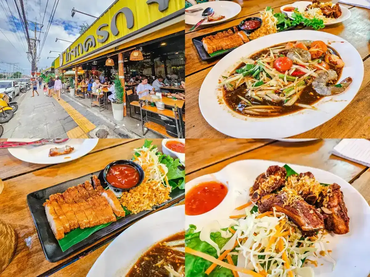 芭達雅美食推薦:Kai Yok Krok Pattaya 餐廳,Pattaya必吃泰式料理與海鮮。圖片顯示多道芭達雅必吃美食,如脆皮豬肉、青木瓜沙拉與烤肋排。這間芭達雅餐廳是芭提雅網紅餐廳,芭達雅旅遊必訪。